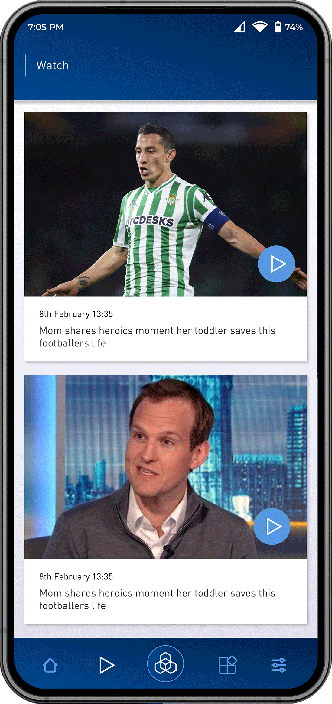 Watch highlights, sports clips, internet videos, and more on the watch tab with new content being updated daily.