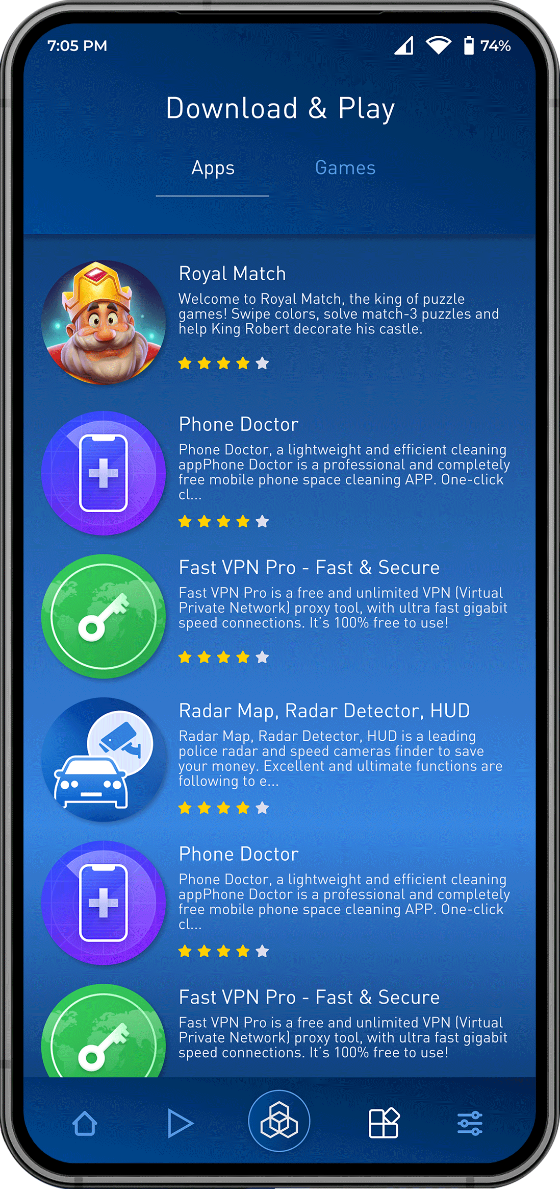 Discover new apps of all categories on our apps tab alongside the news and games sections within the home page of the app.